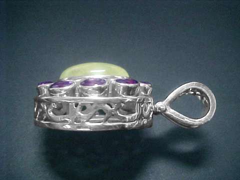 Genuine prehnite with amethyst pendant measuring 2.3" long x 1.2" wide