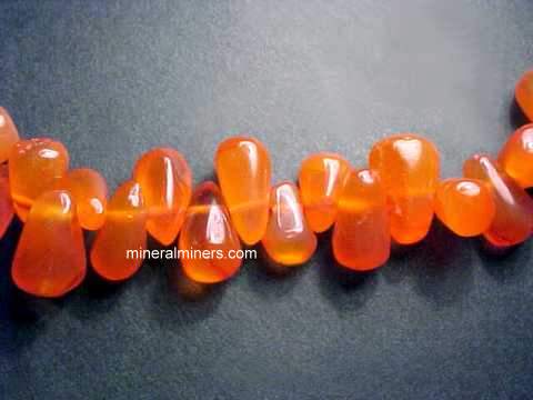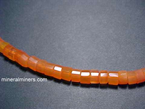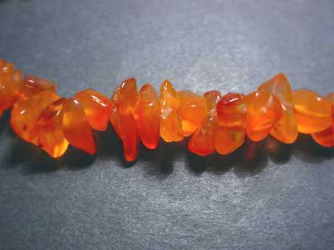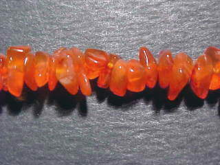 Natural carnelian pieces with rich reddish-orange color were ground into cylinder-shaped beads and then faceted, polished, drilled & strung in an 18 inch length with a sterling silver clasp. The photo at left shows a close-up view. See a full view photo of this genuine carnelian agate necklace. These beautiful necklaces of superior quality faceted carnelian beads make lovely gifts!