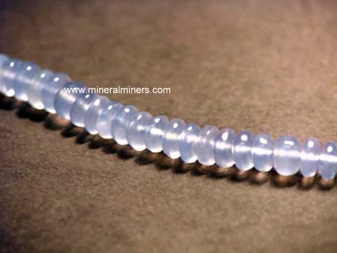 This beautiful necklace of natural color chalcedony beads was hand-crafted from 100% natural chalcedony that was found in Namibia. This pale grayish blue chalcedony was shaped into rounded, disk shaped beads which were then polished, drilled and strung into this chalcedony necklace with an adjustable length from 17.5 to 18.5 inches long using its sterling silver extender clasp. The photo at left shows a close-up view, see also a full view photo of this natural chalcedony necklace. These are all untreated natural chalcedony beads with no dyes, no fillers, and no epoxies! They are 100% natural chalcedony beads, and when examined closely they show occasional natural pits & inclusions. Please see below to order.