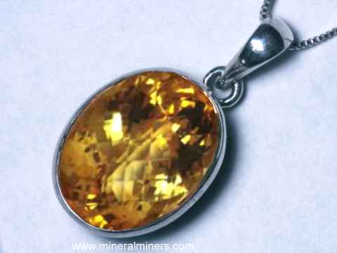 Each one of our citrine jewelry items is set with a genuine citrine gemstone! Here at mineralminers.com, we do not have any man-made citrine, synthetic citrine, or lab-created citrine! Each of our citrine gemstones was faceted from naturally crystallized quartz rough that was mined in Brazil. We specialize in golden citrine jewelry, and we also have lemon citrine jewelry. Natural smoky quartz is treated to make the lemon citrine color. See our selection of lemon citrine gemstones. We have citrine jewelry designs available with faceted citrine gems and also with cabochon citrine gemstones. Our faceted citrine jewelry items are set in solid 14k gold or in solid 925 sterling silver, and our cabochon citrine jewelry designs are set in solid 925 sterling silver. We have a very large selection of genuine citrine jewelry designs set in 925 sterling silver including beautiful citrine rings, citrine bracelets, citrine earrings, citrine necklaces, and citrine pendants. Each of these citrine jewelry items is a handcrafted design with either natural color golden citrine gemstones or with lemon citrine gemstones. See our selection of natural citrine crystals.