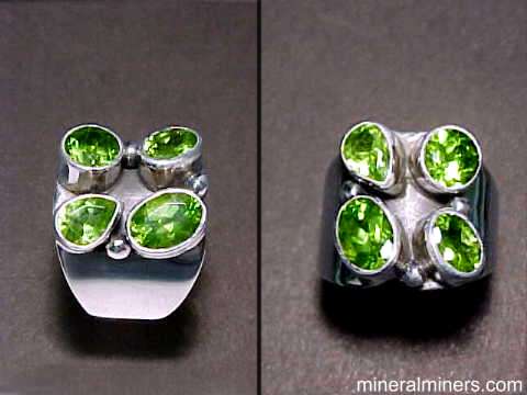This 925 sterling silver peridot ring was handcrafted and set with 4 genuine peridot gemstones weighing 3.6 carats total weight. Each of these beautiful peridot gemstones was faceted from a natural peridot crystal. There is a 6mm round cut peridot gem, a 6.5x4.5mm pear shape, a 6.5x4.5mm oval, and an 8x6mm oval. These genuine peridot gems have transparency ranging from very lightly included to completely eye clean! Please see below to order this genuine peridot ring.