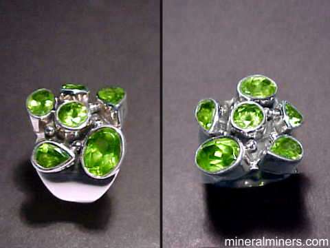 This natural peridot ring was handcrafted in 925 sterling silver and set with 6 genuine peridot gemstones! Each of these peridot gemstones was faceted from a natural peridot crystal. These genuine peridot gems have transparency ranging from very lightly included to eye clean. We have this genuine peridot ring available in several different ring sizes. Please see below to order.