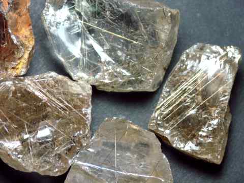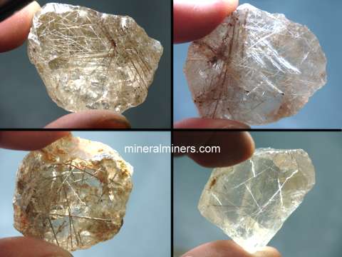 These superior quality specimens of natural rutilated quartz crystal have excellent transparency inside with areas of flawless rock crystal quartz with rutile "needles" criss-crossing through the quartz. See also