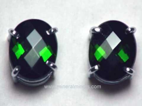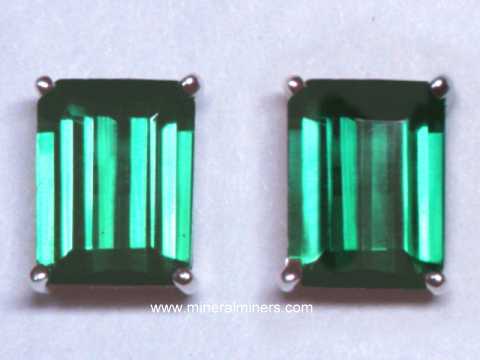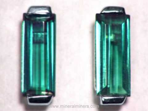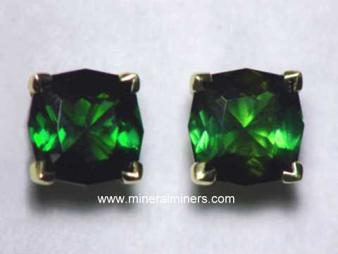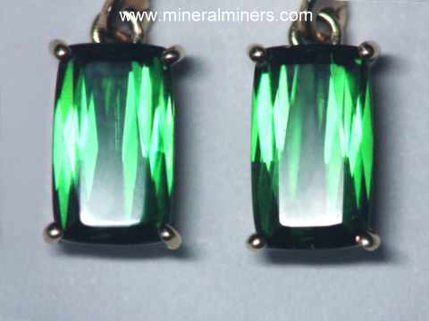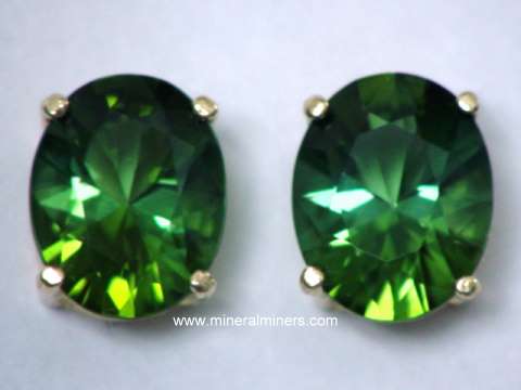 The price of earrings set with natural green tourmaline gems can range significantly depending on the gemstone's clarity (transparency), the shade of green color, and the quality of the gemstone's faceting. Natural green tourmaline gemstone earrings with heavily included to semi-transparent green tourmaline cabochon gems have relatively low values even with fine green hues. The price can increase by up to 100 times that amount for earrings set with eye clean well cut green tourmaline gemstones with fine green color. When the clarity and the color remain constant, the value per carat of natural green tourmaline gemstones does increase as the weight increases. The quality of a green tourmaline gemstone's faceting and its proportions are also important factors when calculating green tourmaline gemstone values. We specialize in natural color green tourmaline gems. Here at mineralminers.com, we do not heat or treat our tourmaline gemstones in any way!