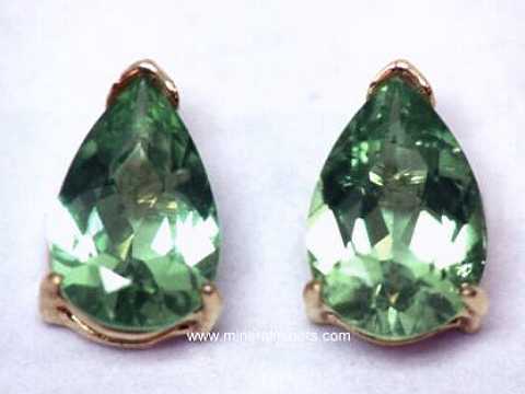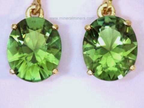 Each of our green tourmaline earrings is set with natural color untreated green tourmaline gemstones that were mined in either Brazil, Africa, or Madagascar. Here at mineralminers.com, we do not have any lab-created green tourmalines, and we do not have any diffusion treated or heat treated green tourmalines! We specialize in genuine natural color green tourmaline earrings that were faceted from natural green tourmaline crystals. A few of our African tourmaline gems have been heated only, and their written description will indicate this. Our green tourmaline earrings are set in solid 14k gold. We have natural green tourmaline earrings available in beautiful shades of light green to dark green tourmaline with all natural colors. We have a large selection of sizes and shapes available as well in fine green tourmaline earrings.