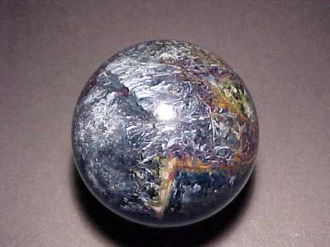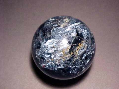 This rare pietersite sphere has chatoyant blue areas all around its surface.