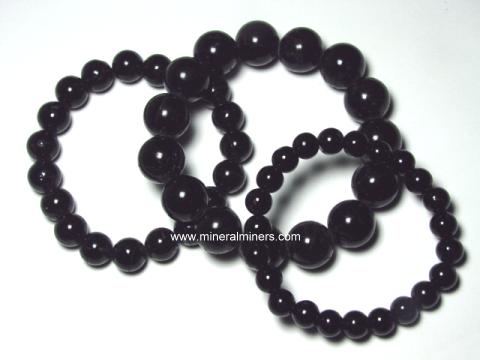Most of these genuine tourmaline beads are so dark that they are actually black tourmalines, while a few are a very dark green or dark brown. These are all untreated natural color tourmaline beads with no dyes, no fillers, and no epoxies! They are 100% natural tourmaline beads, and when examined closely they show natural pits & cracks. See a close-up photo of these black tourmaline beads with occasional flat spots on their surfaces, and there are occasional small inclusions of other minerals within the tourmaline. The beads in these genuine tourmaline bracelets were hand-ground & polished from natural tourmalines mined in Brazil. We have these genuine tourmaline bead bracelets available in four approximate bead diameter sizes, please see below to order.