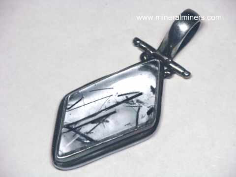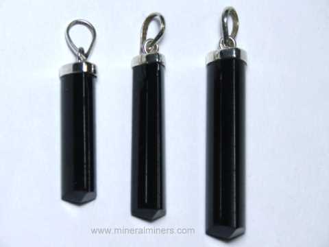Each of these polished black tourmaline crystal pendants is set with a handcrafted 925 sterling silver bezel cap. We have them available with crystal sizes measuring approximately 1.3 inches long for $23.95 each (item tbkj243i), and an extra large size with 1.4 inch long crystals for $26.95 each (item tbkj243e).
