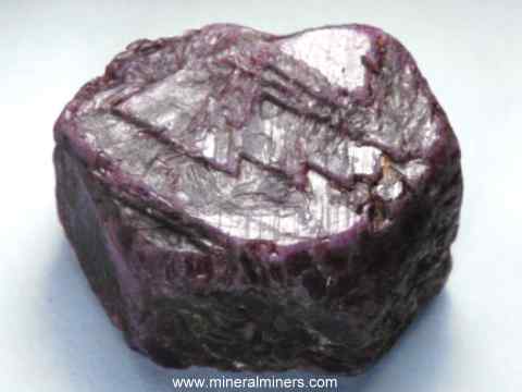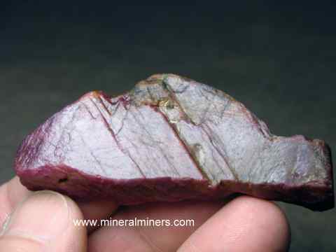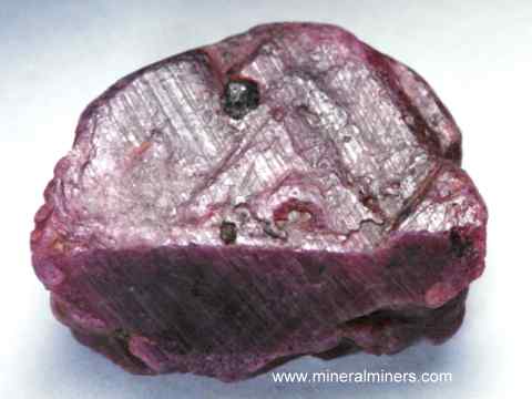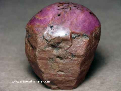 This red corundum mineral specimen is unheated. It is a partially terminated ruby crystal with some very interesting natural surface features. All surfaces of this raw ruby specimen are completely natural - just the way it was found in the earth. It has very rich purplish-red natural color and cabochon gem grade translucency. See an opposite side view of this natural ruby specimen.