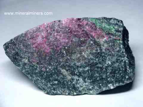 This specimen of natural color ruby in green zoisite rough was mined in Tanzania. There is ruby exposed on both the front and back surfaces in a matrix of green zoisite with black hornblende. See also a back side view of this natural color specimen of ruby in zoisite. This rough specimen of ruby in zoisite makes a nice mineral specimen just as it is, although it could also be used as superior grade lapidary rough.