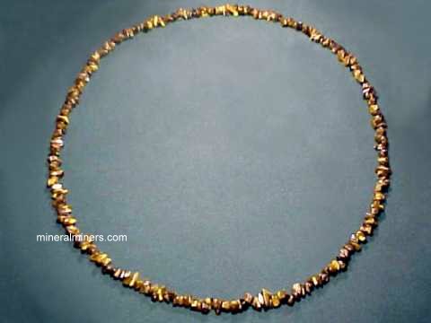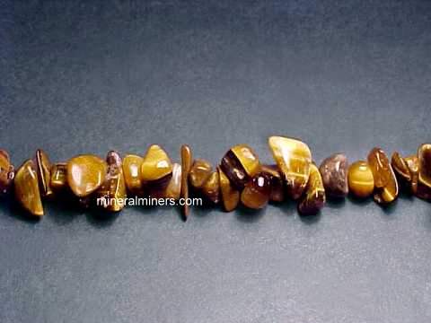Natural tigers eye pieces that were mined in Africa were tumbled and polished in baroque shapes, and then drilled and strung in a 17.5" length. These natural color tigers eye beads have very beautiful, rich golden-brown color. The photo at left shows a close-up view. See also a full view of this genuine tigers eye bead necklace. We have two approximate diameter sizes available (see below): 5-7mm diameter, and also 7-9mm diameter.